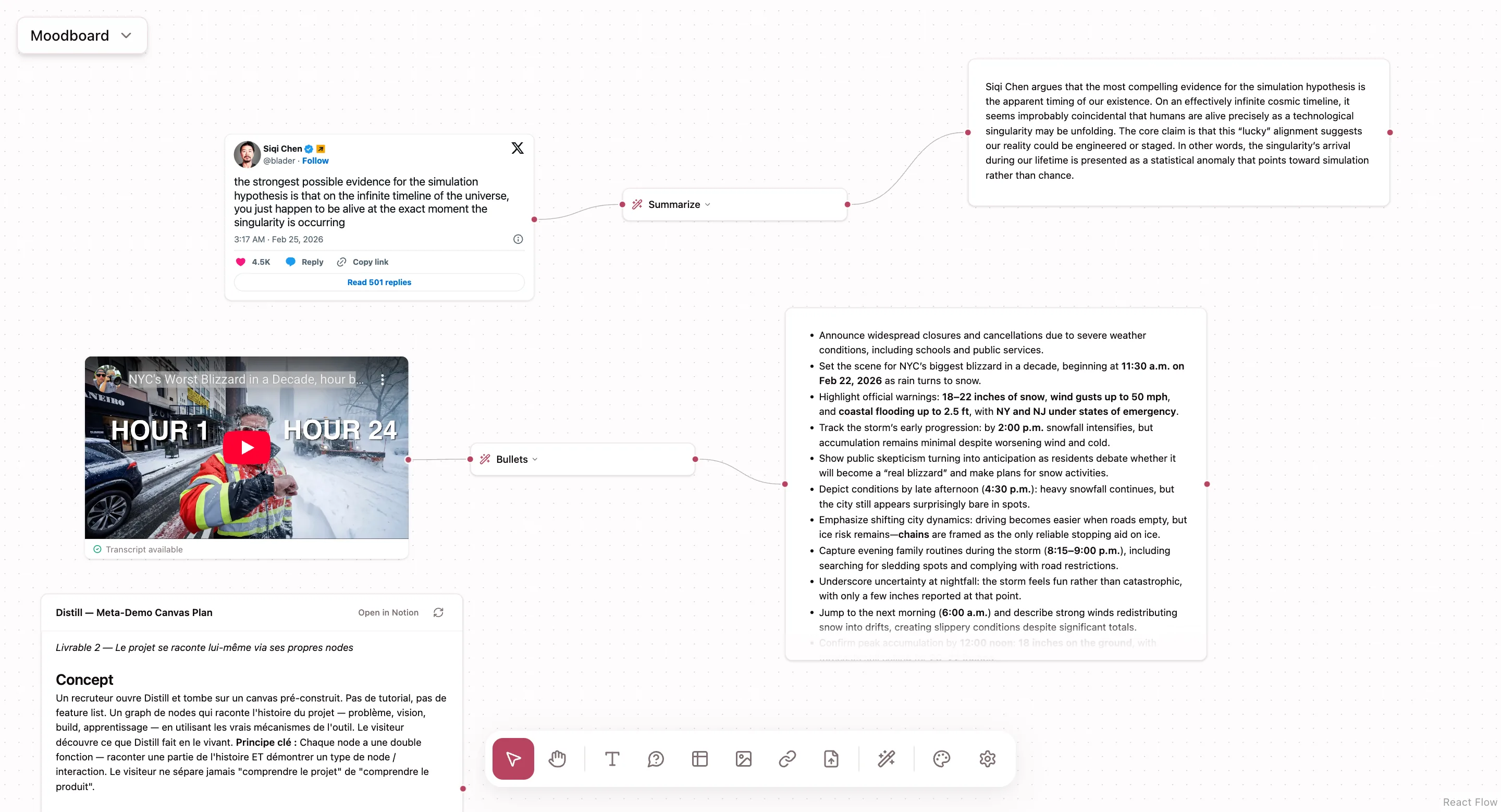 Paste a URL, markdown, table, image, or Notion link. Distill auto-detects the type and creates the right node.