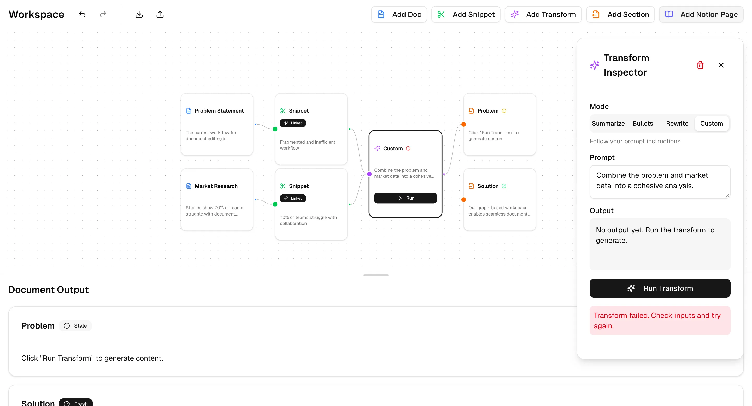I wanted a canvas. Drop your sources as nodes. Connect them to AI transforms: summarize, extract, reformat, compare. Chain transforms together. When you update a source, everything downstream re-runs automatically.