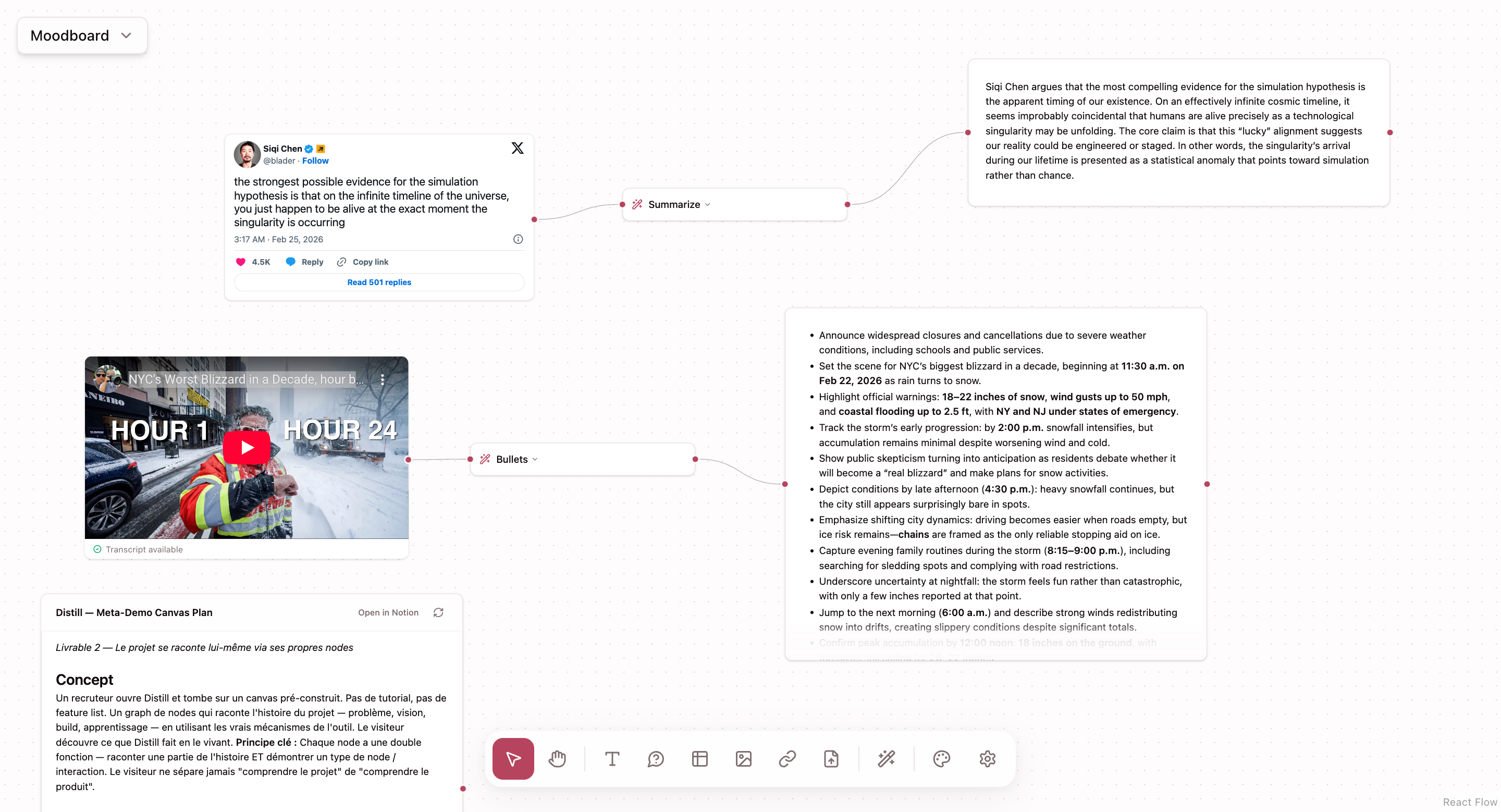 I used Distill to build this portfolio. Notes, links, inspiration, all fed into the canvas, transformed into outlines, then into prompts for Claude Code. One source of truth, multiple outputs. A living document that stays up to date as the thinking evolves.